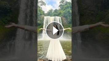 She is sit on a rock near a large waterfall, slightly lean side touch the water with her hands, and look at the camera.8 k hd camera quality without changing her face exactly same as reference photo, hairstyle long layer cut , she is wearing cotton white with green florel anarkali chudithar with full sleeve with minimal jewellery, photo should be ultra realistic , she is looking slim and young