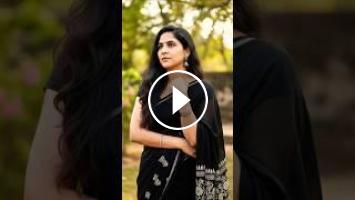 A beautiful young Indian woman with long, dark hair, styled in a traditional yet elegant manner. She is wearing a modern black and off-white patterned saree with a black blouse. Her jewelry includes simple silver jhumka earrings and silver bangles on her left wrist. She is captured in a pensive, slightly upward gaze, with her right hand gently touching her neck/collarbone area, and her left arm gently folded across her body. The setting is a natural, outdoor environment, without changing her face exactly same as reference photo she looks slim and young