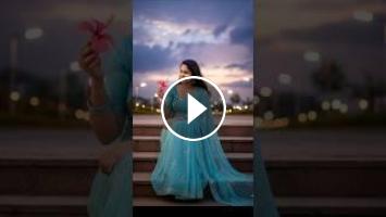 Prompt : An ultra-realistic, 8K portrait of a young Indian woman sitting on stone stairs, romantically smiling as she gently touches a flower she holds. She wears a sky-blue chiffon saree adorned with stone-filled designs and a fitted blouse. The dramatic twilight sky above is a canvas of cinematic clouds, reflecting a creamy soft bokeh effect. Lining the background are roads illuminated by streetlights.