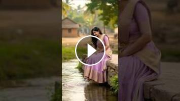 she wearing Kanchan silk material paavadai thaavaani pastel purple colour with detailed embroidery work Pinterest model, , wearing gold jewellery, without changing her face 100% same , weavy hair, 8K hd quality , she should be like sitting on a small bridge on a riverbank in the village and enjoying the flowing water.lotus pond full of lotus