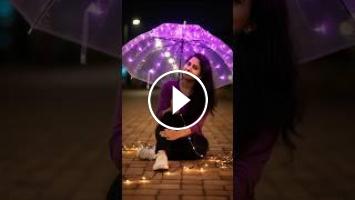A stunningly beautiful young girl sitting casually on a warm, rustic brick-paved ground at night. Se is looking directly at the camera with a playful, se holds a transparent umbrella adorned with shimmering **purple LED string lights**. Warm, golden fairy lights are scattered on the ground around her, creating a brilliant bokeh effect. Se is wearing a purple t-shirt full baju and black pantsand white top sneakers.