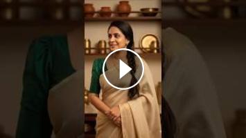 beige/cream handloom saree with thin gold border ANd emerAld Green fitted buff sleeve blouse with elbow-length sleeves. Her long dark HAir is styled in a loose side braid with natural texture. She has minimal natural makeup with a small traditional bindi. Small gold stud earrings and chain with pendant complete her look. She stands with a gentle smile in warm indoor lighting against a traditional kitchen background with wooden shelves,. Without changing her face exactly 100% same as the reference picture, slightly turn side