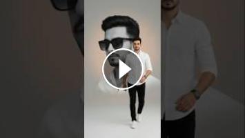 Create a modern fashion campaign poster featuring me with a split-personality concept. Main full-color figure walking right, wearing black pant and white shirt and white shoes. Behind me, a large black-and-white portrait facing slightly left, dark sunglasses, calm, mysterious, Light gray background with warm circular gradient (soft brown/beige) stylish without changing my face and DSLR. 1 00% original and real face form uploaded image.