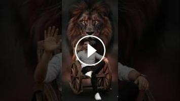 Behind him, there is a massive, artistic red and black lion head illustration with glowing amber eyes, symbolizing power and confidence. The dark moody background is enhanced with soft warm light gradients and subtle smoke effects, creating a cinematic and majestic atmosphere.