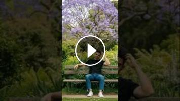 Background features bright green foliage and blooming jacaranda tree with purple flowers, clear daylight, DSLR-level sharpness, natural colors, depth of field, realistic shadows, full-body portrait.