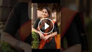 A charming Indian woman with a radiant smile, dressed in a traditional black blouse and a rich black, holud, red,mix saree, leans playfully against an intricately carved wooden railing adorned with delicate green vines. She has long, wavy brown hair styled in a braid over her shoulder, with a statement silver necklace, matching bangles, and a unique silver ring. The background features hints of a warm, rustic setting.don't change face, exactly same as reference photo she looks slim and young