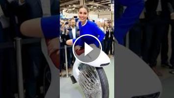 In front of cameras and VIP guests, she jumps on, starts her demo inside the expo hall, and then rides straight out into real traffic for an unbelievable live showcase.
