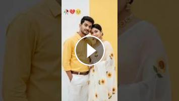 uploaded couple image, the women is wearing a beautiful soft white shiffon saree sunflower motive with yellow blouse with matching accessories. The man wearing matching yellow colour shirt with white colour pant and brown belt. Both are standing with attaching their one by one shoulders and head to each other with and watching towards the camera with soft smile. Camera angle left side. The background is split with a white gradient on the left and a yellow gradient