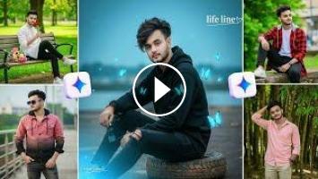 Uploaded man with voluminous dark hair, wearing a black hoodie with red accents and ripped jeans, is relaxing on a low, rustic bike tire. The background is softly blurred, showing an outdoor setting with hints of blue tones. (Reference face) Several luminous blue butterflies are floating around him, light in the bottom left.A small Prince Shanto signature in left corner, In the upper right, there's a graphic text overlay that says 'life line' with a stylized heart and.