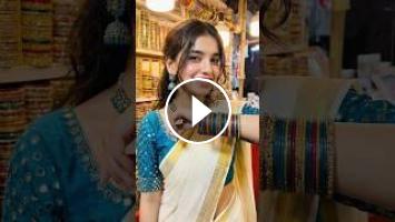 "A beautiful Indian 20 to 30 year old woman dressed in off-white type saree peacock colour mirror work half sleeves blouse standing at a vibrant stall filled with stacks of colorful,matching colour jhumka earrings, and a delicate necklace, smiling as she looks at the bangles on her forearm.The scene is brightly lit by warm lights. Dark brown wavy long layer loose pulled back hair. Smooth glowing skin. Light pink lipstick. showcasing the intricate detail of 100% same face..