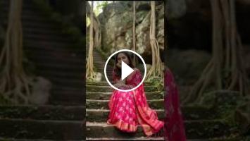 3. Create beautiful young woman with long, wavy darm hair, styled with a small braid at the crOwn. She has a soft, serene expression, resting her chin on her hand. Attire: A vibrant traditional Indian pink - white floral saree. Setting: She is sitting on ancient, moss-cOvered stone steps that lead up toward a rocky cliffside. The background features heavy greenery, hanging tree roots (banyan style), and weathered stone textures, creating a mystical, nature-focused
