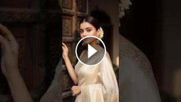 "A portrait of a graceful Indian woman wearing a cream or off-white saree with an elegant embroidered border, standing near a wooden doorway in soft warm lighting. She has subtle, glowing makeup, expressive eyes with kohl, and a small red bindi on her forehead. Her hair is styled in a low bun adorned with white flowers. She wears large, ornate golden jhumka earrings that complement her traditional look. The atmosphere is serene, with a hint of golden sunlight highlighting her face