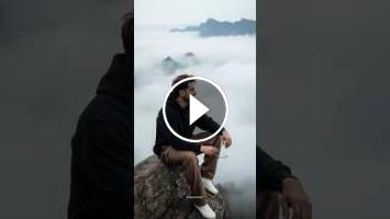 Create a hyper-realistic portrait of a man sitting in a cliff a of rock in mountain, (Used reference photo 100% for Face details) the full shot of a man from the side view, with Wavy Farming massy hair, sitting on the edge of a rocky cliff. He is wearing a Black Oversized Hoodie and Brown oversized pants and white sneakers. A rests on the rock beside him. In the full dence misty background, there is a foggy, vast mountain view with a light, overcast sky. High-quality photo, cinematic light, deep shadows and bright highlights.