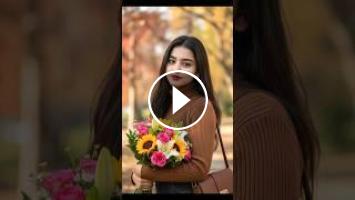 "A beautiful young woman with long, flowing dark hair and striking red lipstick, wearing a stylish brown turtleneck sweater. She carries a brown leather bag slung over her shoulder and holds a vibrant bouquet of mixed flowers including pink, yellow, and white blooms. The background suggests an outdoor, possibly autumnal, setting with soft, blurred foliage. I want exact woman's same face as, I uploaded no alteration 100% same. Ratio 9:16."