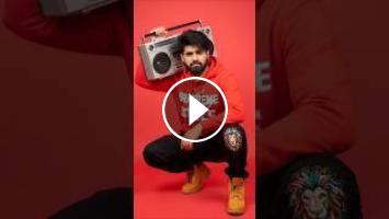 "Create a vibrant, retro-inspired fashion portrait as same face as uploaded image of a young man posing confidently against a bold, solid red background. He is crouching down while holding a large silver vintage boombox on his shoulder, giving off an old-school hip-hop street style vibe. He has tousled, slightly wavy black hair that falls over his forehead, framing his symmetrical face and defined jawline, He wears a bright red hoodie with white graphic text and designs, layered over a yellow shirt, paired with black pants featuring a colorful embroidered patch on one thigh. On his feet are classic tan Timberland boots, adding to the urban streetwear look. The image has strong, clean lighting that enhances the bold colors, emphasizing a stylish and energetic 90s/2000s hip-hop aesthetic."