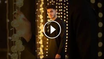 "A young man in a stylish black kurta with fine texture, standing near glowing golden fairy lights. He is facing slightly sideways with one hand resting gently on the string lights while the other hand is relaxed by his side. His gaze is directed confidently towards the camera with a soft smile, giving a charismatic presence. The shot is taken from a slightly low-angle perspective, making him look taller and more dominant in frame. Golden fairy lights create dreamy