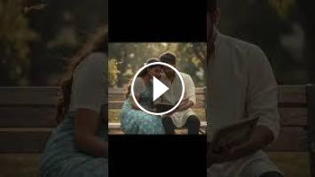 Turn this image into a retro, vintage-inspired cinematic portrait of a couple sitting together on a rustic wooden bench in a breezy outdoor setting. The woman is draped in a soft blue cotton saree with small white flower prints and a white blouse, styled in a Pinterest-inspired 90s aesthetic with silky hair and a small flower tucked in. The man is wearing a classic off-white kurta with rolled-up sleeves and dark trousers, giving a timeless, effortless charm. Both are reading from the same book, with her leaning slightly towards him, suggesting intimacy and connection. Leaves drift in the air, light and shadows play dramatically on their faces, and the atmosphere is moody yet romantic, with grainy textures and warm tones evoking the feel of an old film still