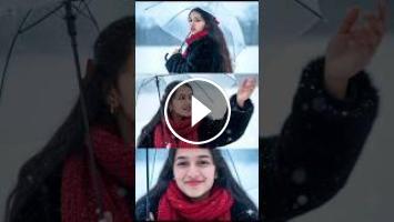 1.) Red scarf- Vertical 4K image, three horizontal sections, featuring the provided face, hairstyle, and body, expressing joy and nostalgia. Scene 1 (Top - Portrait): Character with transparent umbrella, looking back with an editorial gaze, blurred snowy background. Scene 2 (Middle - Full Body):