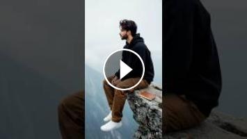 Create a hyper-realistic portrait of a man sitting in a cliff a of rock in mountain, (Used reference photo 100% for Face details) the full shot of a man from the side view, with Wavy Farming massy hair, sitting on the edge of a rocky cliff.
