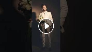 Prompt : "Create an image of a young man in a crisp white suit, holding a bouquet of white flowers in his right hand with his left hand casually in his pocket. He has dark hair and is looking upwards with a subtle smile. The background is dark with a warm light casting a shadow of the man on a wall behind him." Young man in a white suit. Holding white flowers, one hand in pocket, looking up. Dramatic shadow and warm Dark with a shadow cast on a wall.