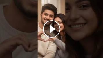 A romantic close-up portrait of a happy couple smiling warmly through a heart shape made with their hands, symbolizing love and togetherness. The man has a neatly trimmed beard and short dark hair, while the woman has long brown hair and soft dimples. Both wear cozy neutral-toned sweaters, exuding natural intimacy and warmth. The background is softly blurred, emphasizing their joyful faces framed perfectly inside the heart shape. The lighting is soft and natural, creating a cinematic, m