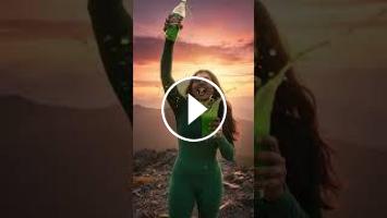Prompt: A hyper-realistic cinematic scene of a woman standing confidently on a mountain top during a glowing sunrise/sunset, wearing a stylish dark green body hugging top. The warm sky behind her blends deep oranges, pinks, and golden tones, casting dramatic light across the rugged landscape.