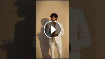 Create a retro vintage grainy but bright image of the reference picture but draped in a perfect red wine color Pinteresty aesthetic retro shirt with white pant and holding a rose flower in hands. It must feel like a 90s movie and romanticising windy environment. The boy is standing against a solid wall deep shadows and contrast drama, creating a mysterious and artistic atmosphere where the lighting is warm with a golden tones of evoking a sunset or golden hour glow. The background is minimalist and slightly textured the expression on her face is moody, calm yet happy and introspective.