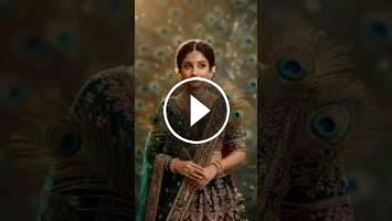 A regal depiction of a woman with an intricate updo, wearing a heavily embellished lehenga choli, a bindi on her forehead, and a subtle smile, holding peacock feathers, with a dreamy, soft-focused background dominated by the iridescent eyes of peacock feathers, golden hour lighting.