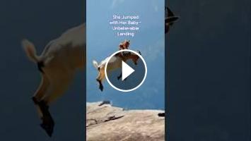 A mother mountain goat fearlessly leaps across a massive cliff while carrying her baby on her back. This incredible moment shows the perfect balance of instinct and courage in the wild.