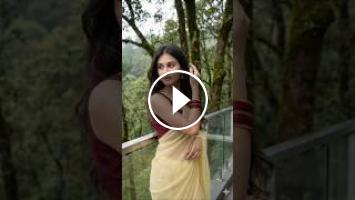 A beautiful young woman with long, slightly wavy dark hair, wearing a sheer pale-yellow saree and a deep maroon sleeveless blouse. She has gold drop earrings, a delicate gold chain, and red bangles on her right wrist. Natural, soft makeup with a dreamy gaze to the left. She poses on a modern balcony with glass panels, hand raised to her hair. Background: lush green forest, mossy tree trunks, soft overcast light, serene hillside atmosphere. Don't change her face.