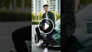 8K Hyper realistic cinematic portrait of a stylish young man sitting on the hood of a Lexus dark-green sports car, modern lifestyle shot, same exact face as in the reference photo (do not alter the face), natural hairstyle, confident expression, wearing a green jacket, white t-shirt, black pants, white sneakers, fashion model posture, soft sunlight, high-detail textures on clothing, premium car reflections, modern building in background, rich.