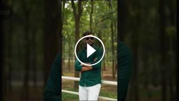 Convert 4k hd realistic potrait of a person (face same as uploaded)here's a full shot of a slim handsome man in a dark green shirt and white pants leaning against a white railing, wearing sunglasses, and watch on wrist with a green forest background, captured in natural lighting.