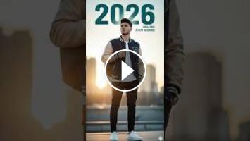 A cinematic portrait of a stylish man, standing one hand in his pocket and the other holding the strap of his backpack, looking slightly upward as if embracing new possibilities. Wears varsity jacket, white Tee, tapered black joggers, and clean white sneakers. Above him, large stylized text reads: "2026" in a bold, slightly distressed teal font, with smaller text below: "365/365" and "A NEW BEGINNING". Cinematic photography style, highly detailed, soft lighting, dreamy atmosphere,New Year theme
