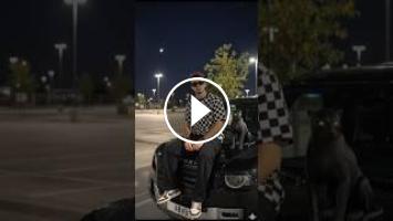 A keeping the same face and hairstyle of 20 years old man with dark,wearing a black and white chack buffer tshirt, black cargo lose jeans, brown-white sneakers,bracelet,chain,wristwatch,Sunglasses on eyes, sitting casually on the hood of a sleek black Defender car side seating black panther. One hand is on their head,the other on the car.The setting is an outdoor parking lot at night,illuminated by numerous streetlights.A crescent moon is visible in dark sky,and a small tree is behind