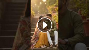 A lovely couple sitting together on stone stairs, exuding warmth and elegance. The man wears a stylish olive green kurta with white pants, while the woman looks graceful in a mustard-yellow ethnic dress with a floral dupatta. Surrounded by natural beauty and soft light, the photo radiates love, comfort, and timeless connection.