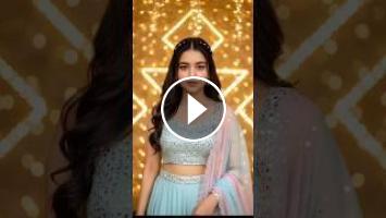 A stunning Indian woman with long wavy hair and soft glam makeup. She’s dressed in a pastel-colored Indo-western outfit — a flowy palazzo, crop blouse with mirror work, and a matching dupatta draped stylishly. Background: soft golden lights and festive décor with fairy lights in bokeh.
