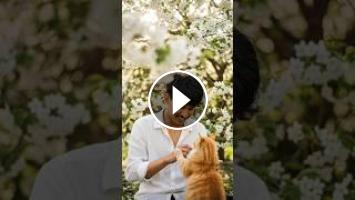 Outdoor portrait photograph with a bright low-angle perspective. The main subject is a young Asian man with smooth skin [reference man on the photo] and messy black hair, looking at a cat with a happy expression. The man is wearing a broken white linen shirt, he is in the middle of a dense white flowering tree, with the flowers framing his face and the top of the frame, creating a beautiful blurred effect in the foreground and background.playing with cat