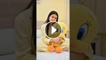 "A young woman indoors sitting on a bed, wearing silky pastel yellow satin pajamas with white pipinged She hugs a large Tweety Bird plush with big blue eyes and orange feet, smiling softly at the camera. Her hair is long, straight, and natural. Background is pastel yellow, softly lit, creating a cozy, dreamy, cartoon-inspired monde Face change. I want exact man same face as, I uploaded no alteration 100% same. Ratio 9:16."