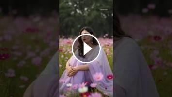 An ultra-realistic cinematic portrait of a young woman seated in a lush field filled with blooming Cosmos flowers in shades of soft pink, magenta, and white. She is dressed in a delicate lilac sheer saree draped gracefully over a crisp white full-sleeve blouse, paired with large oxidized silver jhumka earrings that subtly catch the light.