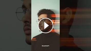 Photorealistic studio portrait, side profile of a young man with dark, curly hair and a short beard, wearing round glasses with thin frames and a black turtleneck. His gaze is directed to the left. The background is a clean, minimalist off-white or light gray. There are pronounced horizontal motion blur streaks originating from behind and around his head, extending towards the right side of the frame. These streaks are bright orange and red, creating a glowing, energetic effect, and subtly fade into softer, darker blurs on the right. There's a subtle film grain or dust overlay throughout the image, giving it a vintage or distressed photographic quality. The lighting is soft and even,
